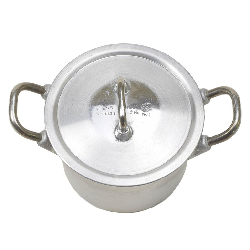Présentation du pot de camping polyvalent de 2 litres, un incontournable de l'équipement militaire allemand, généralement fabriqué en aluminium durable. Cet ustensile de cuisine pratique et compact est indispensable pour les activités de plein air comme la randonnée et le camping.