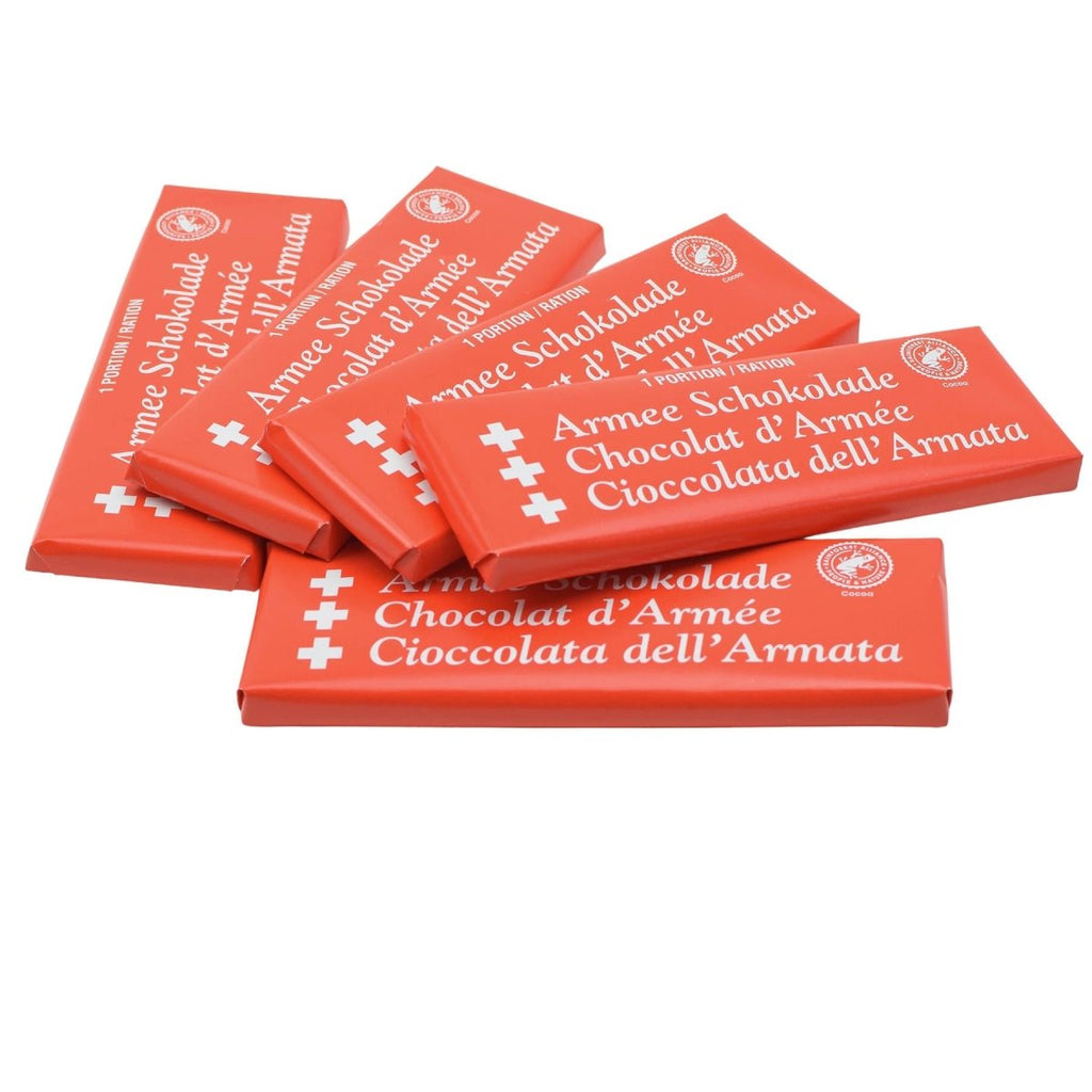 • Parfaite pour les aventures en plein air ou pour un regain d'énergie rapide, cette savoureuse barre de chocolat constitue une gâterie satisfaisante lorsque vous en avez le plus besoin. Avec au moins 35 % de cacao, le chocolat militaire suisse associe des saveurs riches avec une pointe de vanilline pour une expérience délicieuse.