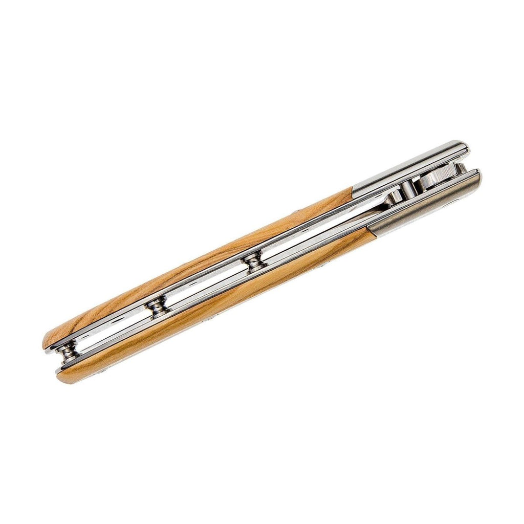 - Le manche en bois d'olivier montre un grain naturel unique. Les cadres en acier inoxydable ajoutent de la solidité et une touche classique et polie. Le couteau équilibre élégance et durabilité, ce qui le rend idéal pour à la fois pour un usage quotidien et pour des occasions spéciales.