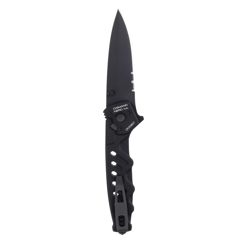 • Le lame partiellement dentelée ajoute polyvalence supplémentaire, vous permettant de couper des matériaux plus durs avec facilité. C'est finition entièrement noire donne au couteau un apparence élégante et tactique, idéal pour les militaires, les forces de l'ordre et les amateurs de plein air.