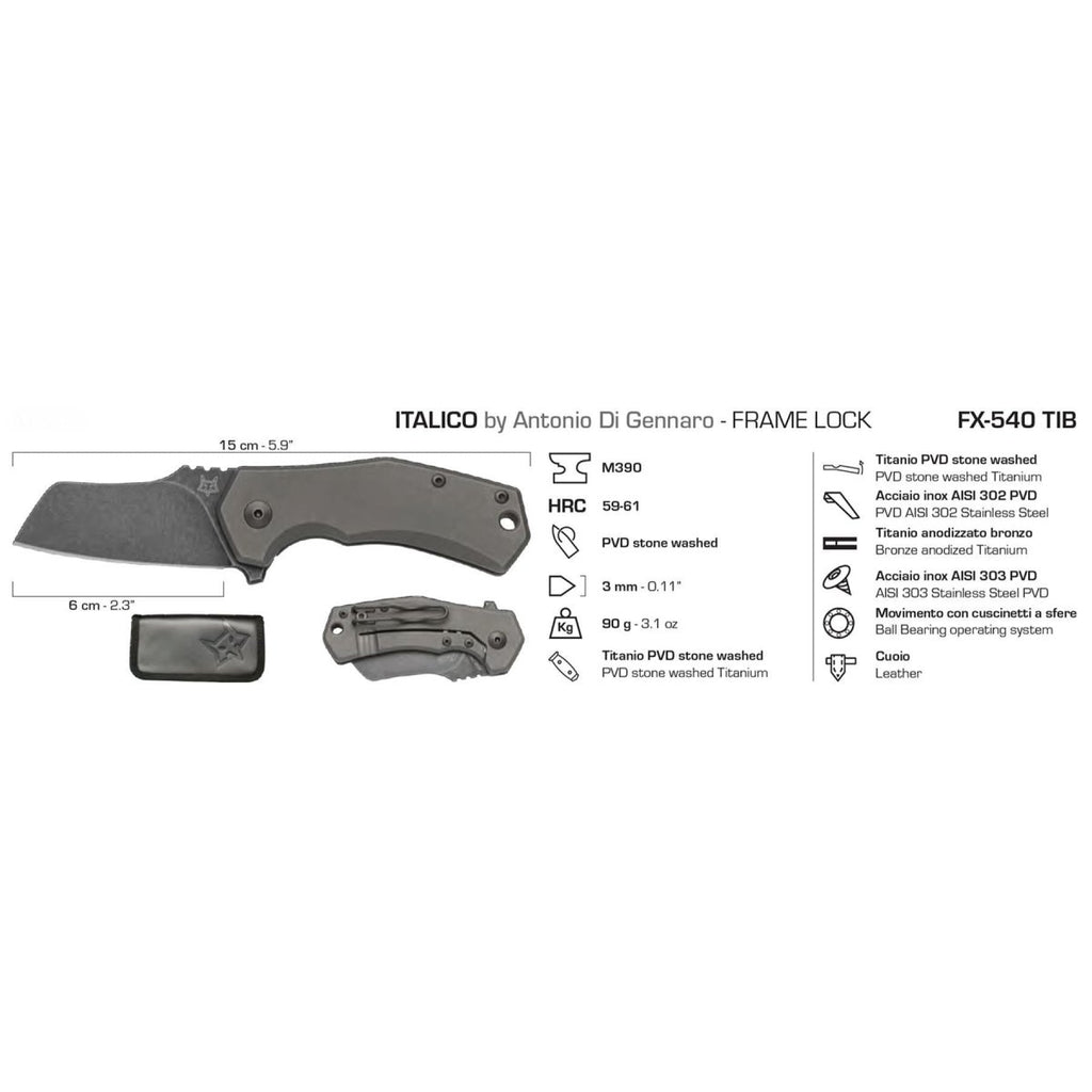 - Ce couteau pliant compact convient aussi bien aux aventures en plein air qu'aux besoins de transport quotidiens. Il combine fonctionnalité, confort et style dans un seul outil fiable. Le savoir-faire de Fox Knives garantit que l'ITALICO livre performances et polyvalence durables.