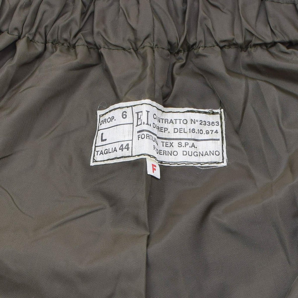 Il s'agit de pantalons de pluie militaires italiens qui étaient initialement destinés aux membres de l'armée de l'air italienne. Ils sont de couleur olive OD et sont doublés thermiquement pour plus de chaleur et de confort. Le pantalon est doté d'ouvertures latérales à crochets et boucles sur les jambes, ce qui le rend facile à enfiler et à enlever par-dessus des bottes ou d'autres chaussures. Le pantalon est conçu pour protéger celui qui le porte de la pluie et d'autres éléments, et sa construction de qualité militaire garantit sa durabilité. Les pantalons de pluie militaires italiens peuvent être portés seuls ou par-dessus d'autres couches de vêtements pour fournir une isolation et une protection supplémentaires contre les éléments.