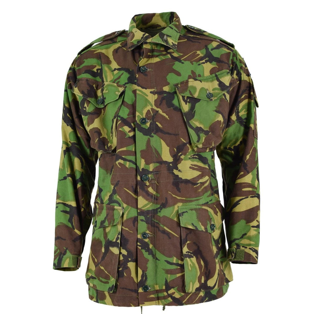 Présentation de la veste smockée militaire britannique BDU (Battle Dress Uniform) en camouflage boisé. Une veste de combat robuste et polyvalente conçue pour une utilisation extérieure et tactique.