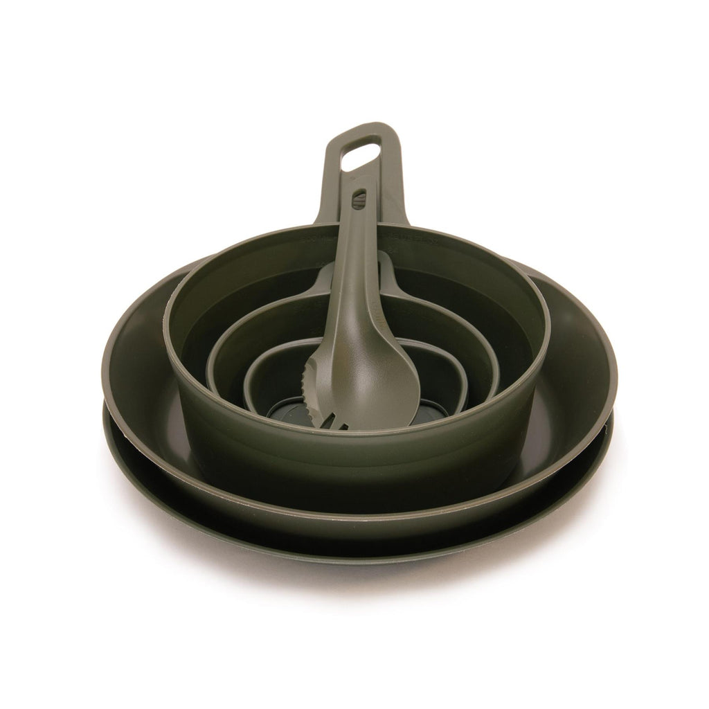 Assiette Camper profonde (poids : 82 g, taille : 15,5 x 4,5 cm), assiette Camper plate (poids : 68 g, taille : 15,5 x 2 cm), Kåsa XL (volume : 900 ml, poids : 83 g, taille : 15 x 6 cm), bol Kåsa (volume : 350 ml, poids : 31 g, taille : 11,5 x 4 cm), tasse pliable (volume : 250 ml, poids : 25 g, taille : 9,5 x 7 x 3,5 cm), cuillère-fourchette (poids : 8,5 g, taille : 16,5 x 6,5 cm). Chaque article est conçu pour être compact et empilable, ce qui permet un rangement et un transport faciles.