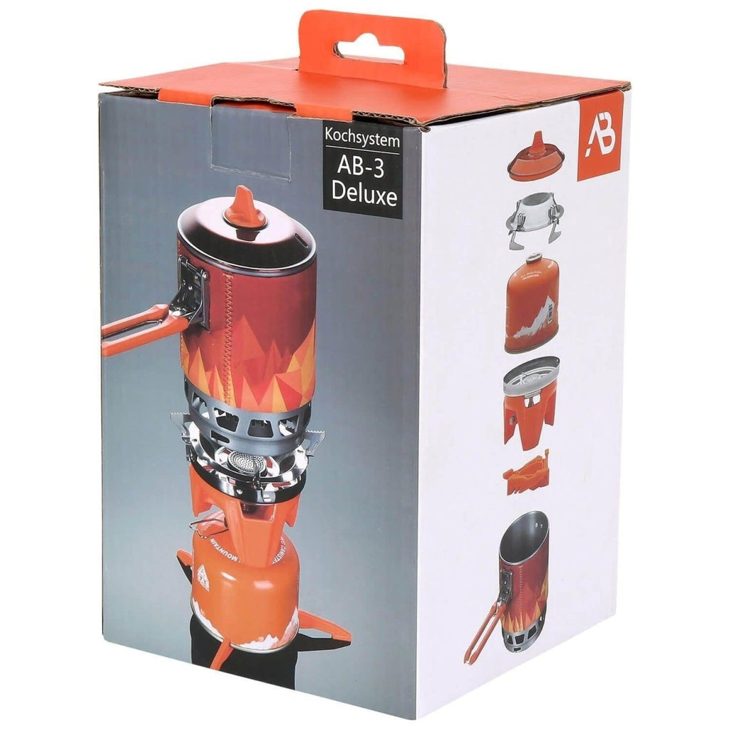 Compact gasfornuis met innovatief design. De AB-3 Deluxe bestaat uit een pot van 0,8 liter met een neopreen hoes (isoleert voedsel en beschermt tegen brandwonden). Verwarmingsribben en adapter voor het branderelement. De constructie met windbescherming en warmtewisselaars maakt ca. 40% minder brandstofverbruik dan op een eenvoudig gasfornuis. Incl. patroonhouder. Het fornuis kan met alle in de handel verkrijgbare schroefgaspatronen worden gebruikt.