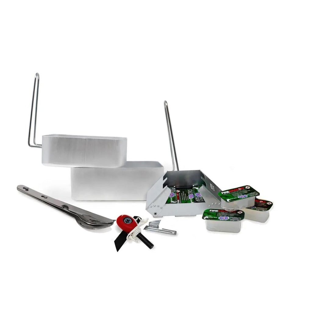 - SET INCLUDES : Fornuis, rommelblikken, bestek set, vaste brandstof, blikopener, flint, spits