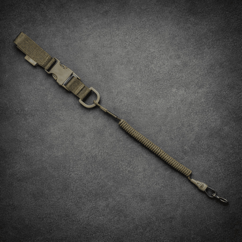 Het veiligheidskoord is uitgerust met een metalen D-ring en karabijnhaak en maakt een snelle bevestiging aan uitrusting, riemen of MOLLE-compatibele apparatuur mogelijk. De Fastex snelsluiting maakt snel en gemakkelijk losmaken mogelijk wanneer dat nodig is.