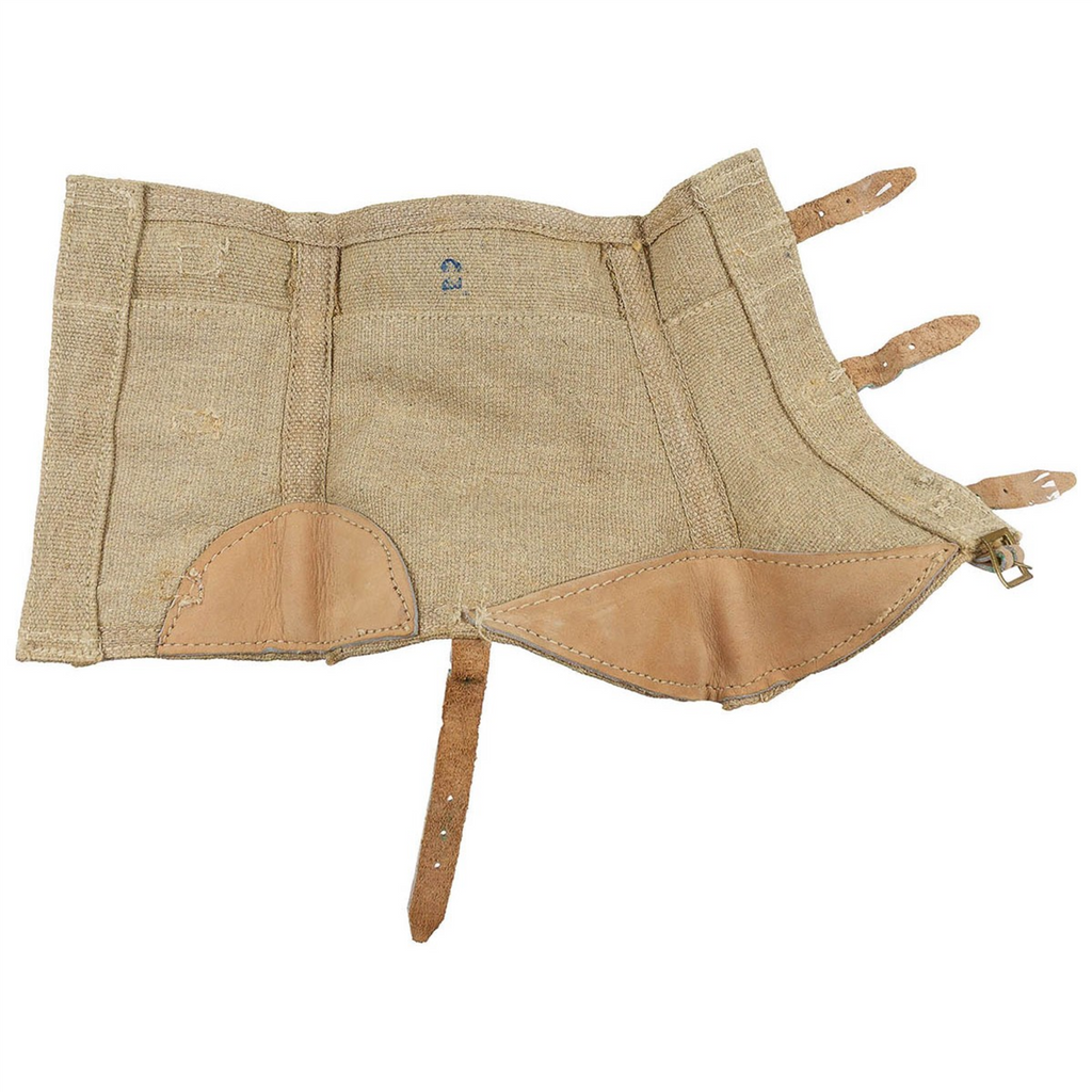 Originele Italiaanse militaire overtollige beenkappen gemaakt van duurzaam canvasmateriaal met versterkte leren inzetstukken. Deze beenkappen zijn ontworpen om over laarzen en onderbenen te worden gedragen en bieden betrouwbare bescherming tegen vuil, modder, vocht en vuil in buiten- en veldomstandigheden.